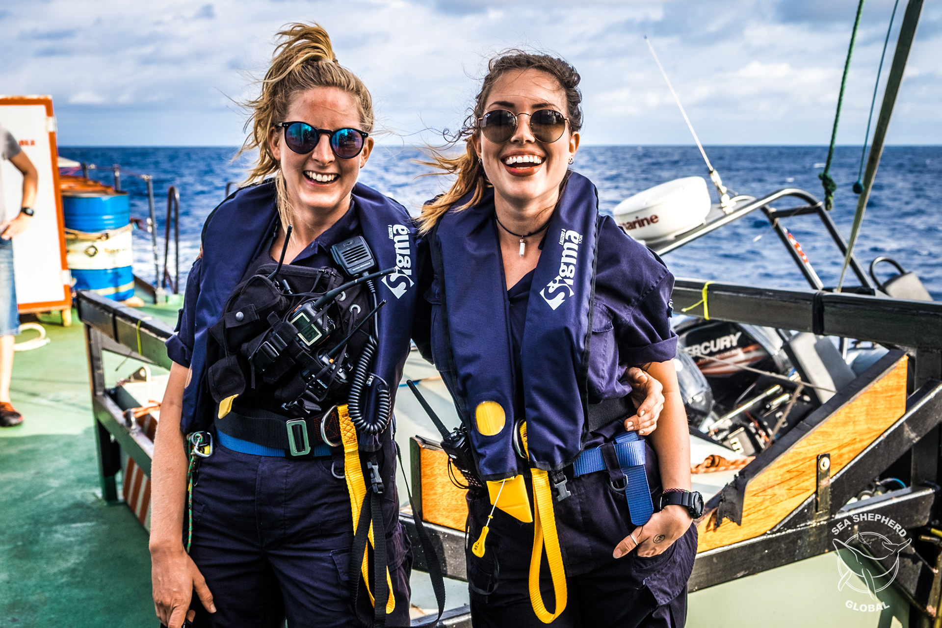 My bestie/crew-mate, Lucie, and I prepared to head out to board and inspect a suspicious fishing vessel whilst on campaign for Sea Shepherd Global during Operation Sola Stella II off the West Coast of Africa, Liberia, 2017.